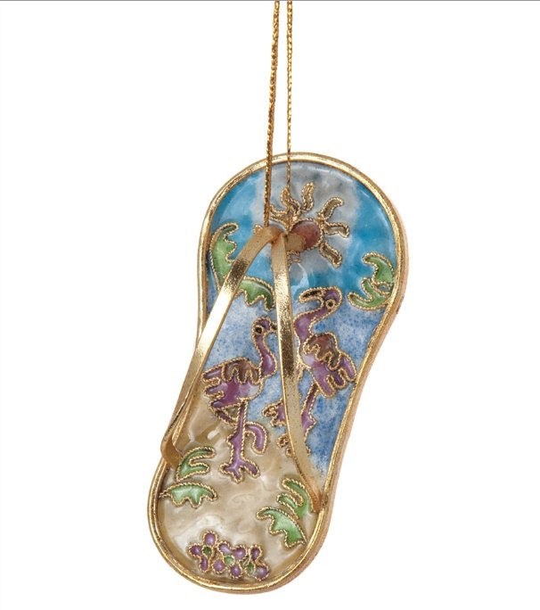 Whimsical golden flip flops bring a summer smile, even if it's snowing outside! Deck your tree with tiny sand shoes, beautifully enameled and accented with delicate gold-plated lighthouses, flamingos, beach umbrellas and shore-side scenes.