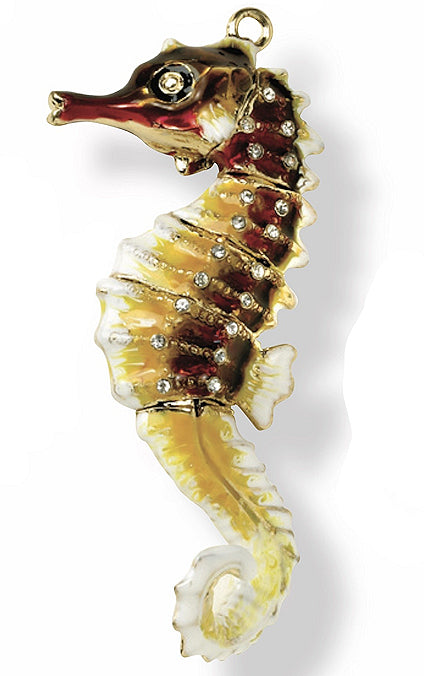Like regal sentinels of the deep, vibrantly colored seahorses stand at attention among your Christmas tree's branches. Tiny hinges along their bodies allow them to bend and sway as if caught up in a deep sea current. Tiny crystal clear accents sparkle among the tree lights. Each ornament is beautifully enameled and accented in gold plate.