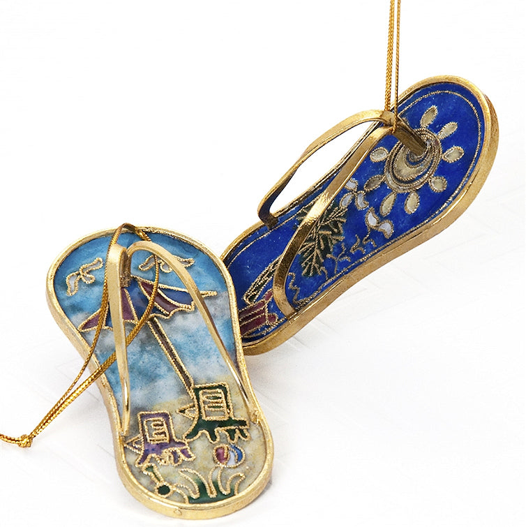 Whimsical golden flip flops bring a summer smile, even if it's snowing outside! Deck your tree with tiny sand shoes, beautifully enameled and accented with delicate gold-plated lighthouses, flamingos, beach umbrellas and shore-side scenes.