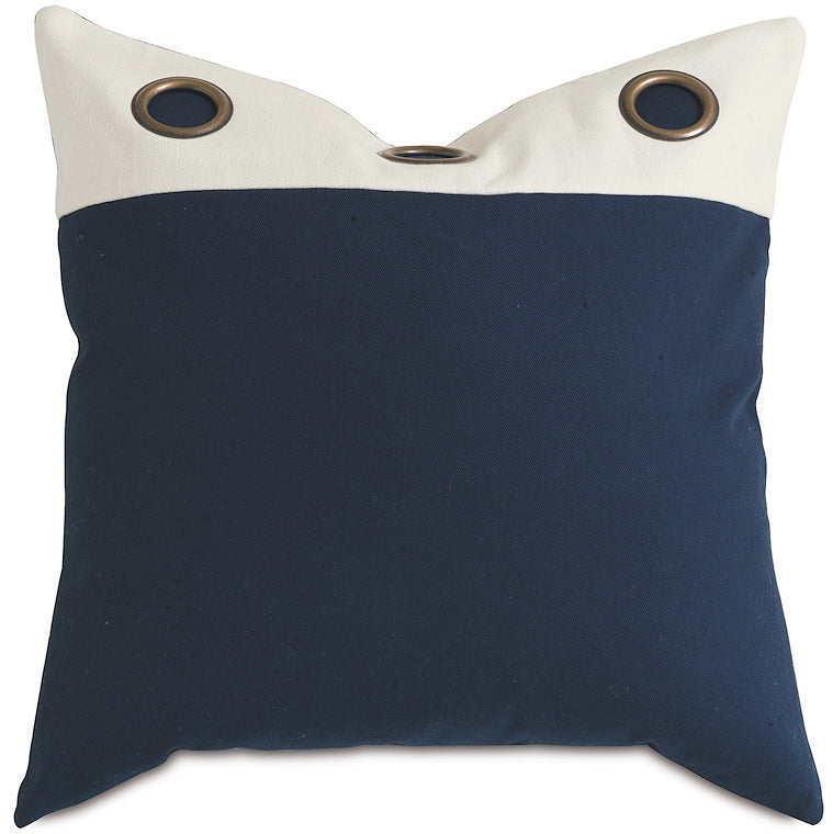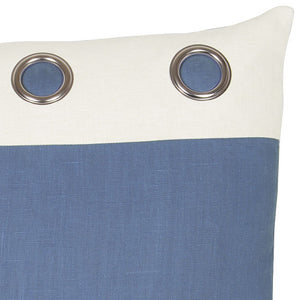 Simple, clean lines, classic coastal/nautical colors, and marine-style grommets create a strikingly contemporary pillow. Pillows feature a band of natural fine twill fabric with three metal grommets backed by the fine navy or light denim twill fabric.