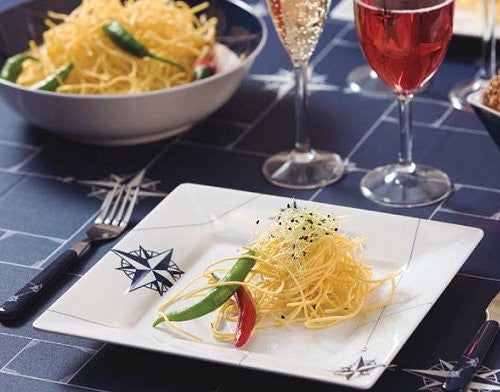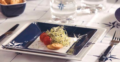 A seafaring guide for centuries, the North Star takes center stage on our Northern Star break-resistant dinnerware. Northern Star Square Dinnerware, with its sleek angles, gives your table a sophisticated nautical look. Created in Spain, this durable dinnerware features a classic nautical compass rose design on bright white melamine.