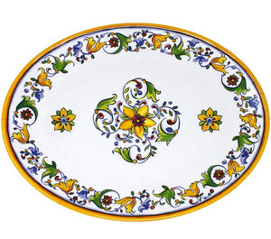 Sicilian Summer features a traditional floral design in sunny yellow and blue, set on a white ceramic-like background. Lead and cadmium free, it is dishwasher safe, but not recommended for microwave use.